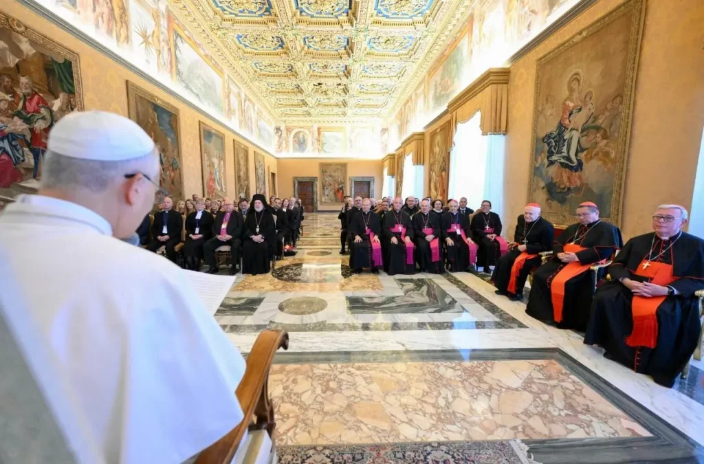 Đức Thánh Cha chào phái đoàn các thành viên của các Hội đồng Giáo hội tham gia ký kết bản cập nhật của Charta Oecumenica (Hiến chương Đại kết) tại Đan viện Tre Fontane, gần nơi Thánh Phaolô chịu tử đạo, bằng lời chào của Thánh Phaolô gửi Timôthê: “Xin Thiên Chúa Cha và Đức Giêsu Kitô, Chúa chúng ta, ban cho anh em ân sủng, lòng thương xót và bình an” (1 Tm 1,2).