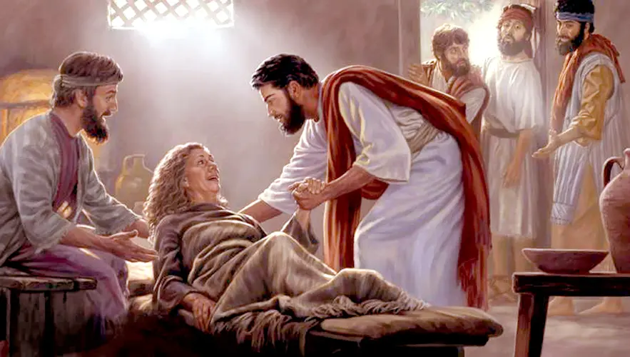 Lúc ấy bà nhạc gia của Simon cảm sốt nằm trên giường, lập tức người ta nói cho Người biết bệnh tình của bà. Tiến lại gần, Người cầm tay bà, và nâng đỡ dậy. Bà liền khỏi cảm sốt và đi tiếp đãi các Ngài.